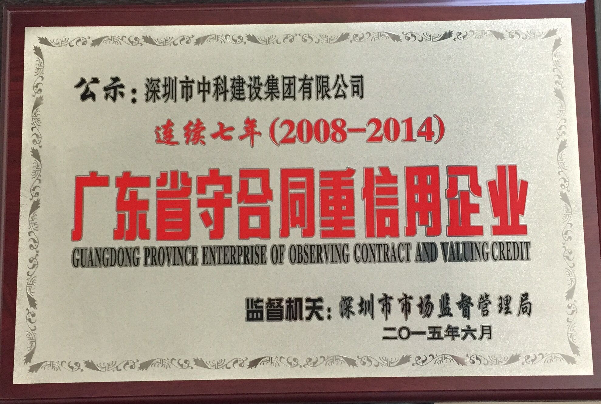 近日,2014年度“广东省守合同重信用企业”评选结果出炉,中科建设被授予“广东省守合同重信用企业”的荣誉称号,这是中科建设自2008年以来连续七年获此殊荣。