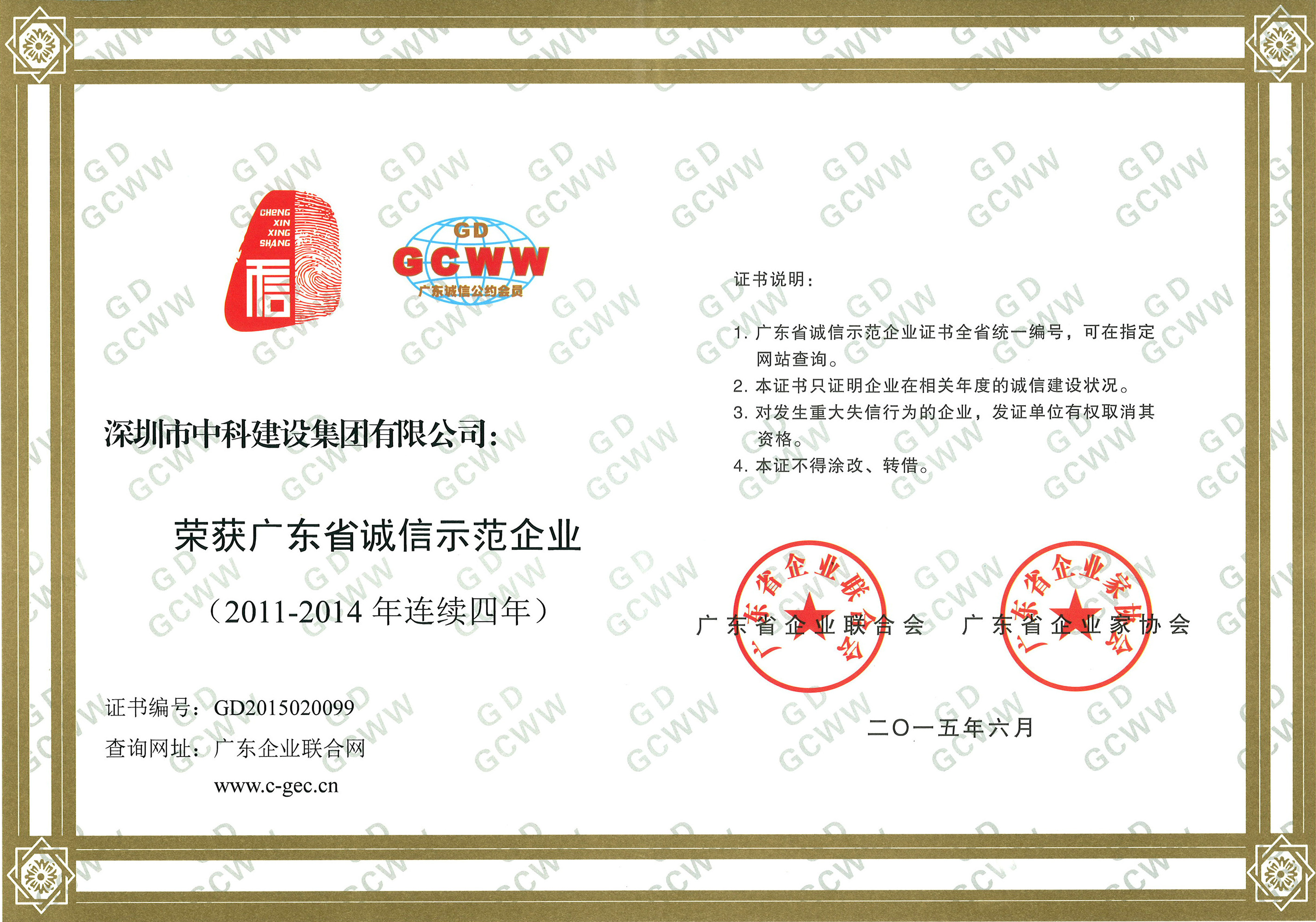近日,由广东省企业联合会、省企业家协会主办的第21届广东省“新常态,新机遇,新发展--企业家活动日”大会在广州白云国际会议中心隆重举行。会上,对2014年度广东省优秀企业、优秀企业家、最佳诚信企业、诚信示范企业予以了表彰。中科建设集团荣获“2014年度广东省诚信示范企业”称号,这是继2011年以来连续4年荣获"广东省诚信示范企业"称号。