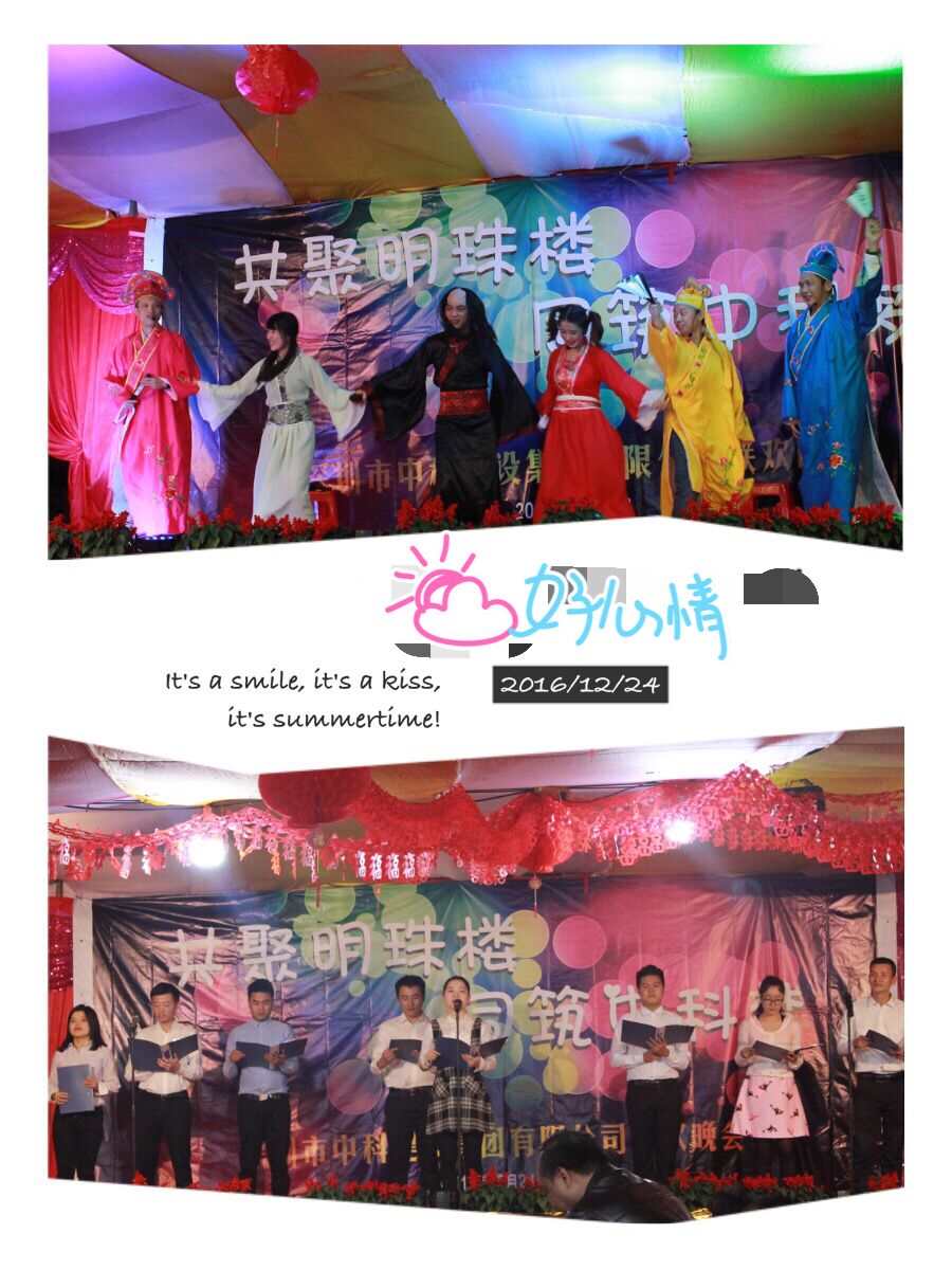冬日传情,暖意中科,2016年12月24日,在有着中国建筑装饰之乡的陆河,中科人别开生面的在叶董事长新居举行了“共聚明珠楼,同筑中科梦”的联欢晚会。由中科人自编自导的精彩节目表演,温暖连线驻外人员及激动人心的抽奖环节,将晚会不断推向高潮。整个晚会气氛欢快祥和,体现了中科人积极向上的精神面貌,传递着中科人团结友爱的正能量。