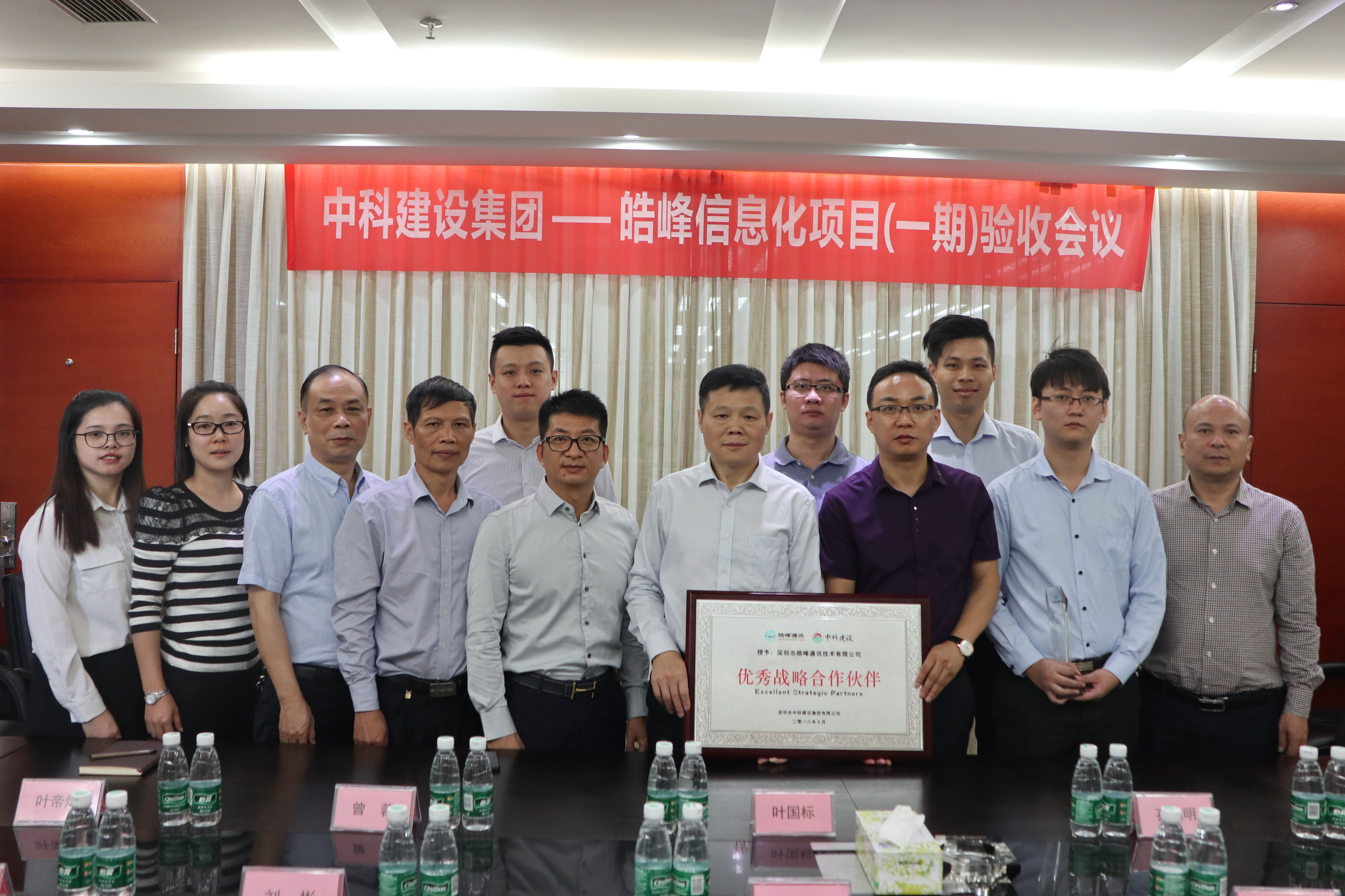 金秋十月,正值收获的季节。2018年10月30日上午,中科建设集团信息化项目(一期)验收会议在集团总部召开,中科建设集团董事长叶国标携高管及信息化项目小组成员出席会议。项目实施单位深圳市皓峰通讯技术有限公司毛孝鹍总经理带领项目实施团队共同参加本次会议。